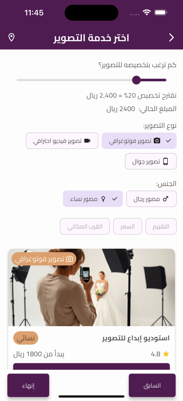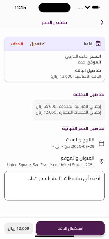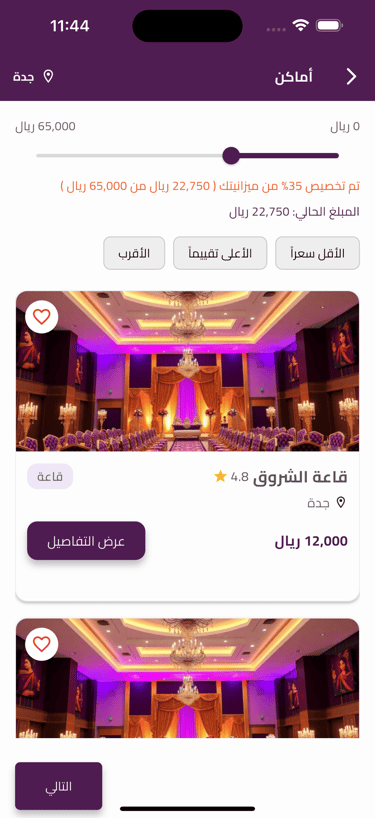 اختيار ذكي وسهل للقاعات والمواقع بحسب الميزانية والموقع والتقييم.